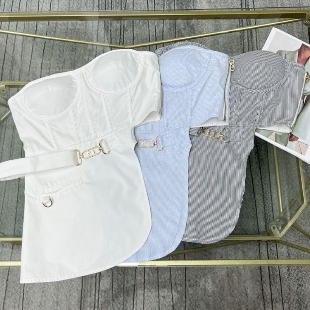 توب فندي له تصميم غير متماثل يغلق بسحاب جانبي، التوب مصنوع من القطن منتهي بقطعة تشبه المشد كما أنه مزين بحزام جانبي، يمكنك الحصول عليه الآن من متجر لولي .